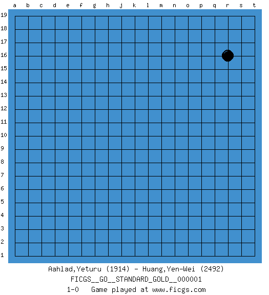 Last move : 1-0 2020 April 10 0:5:49 [Event "FICGS__GO__STANDARD_GOLD__000001"] [Site "FICGS"] [Date "2020.03.10"] [Round "2"] [Black "Aahlad,Yeturu"] [White "Huang,Yen-Wei"] [Result "1-0"] [Rating 1 "1914"] [Rating 2 "2492"] 1.r16 1-0 This go game has been lost on time (started : 2020.03.10 20:26:38) Here are the names of the openings (joseki) played in the four corners : Player Black won this Go (weiqi, baduk) game. Follow this game move after move (download)The L-group is dead. (Anonymous) In my experience, there's no such thing as luck. (Obi-Wan Kenobi in Star Wars ep.4)
