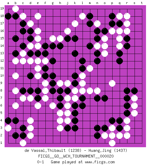 Last move : 0-1 2020 August 2 13:33:58 [Event "FICGS__GO__WCH_TOURNAMENT__000020"] [Site "FICGS"] [Date "2020.03.12"] [Round "1"] [Black "de Vassal,Thibault"] [White "Huang,Jing"] [Result "0-1"] [Rating 1 "1238"] [Rating 2 "1437"] 1.q4 d4 2.q17 d17 3.r15 k17 4.d15 e15 5.d16 e16 6.c17 c18 7.c16 e18 8.d13 e14 9.d10 c7 10.k4 r3 11.q3 r4 12.r5 s5 13.r6 s6 14.r7 h3 15.j3 h4 16.k6 q14 17.q12 q15 18.r14 q16 19.p17 r16 20.q13 r17 21.n13 n17 22.k13 s7 23.r8 k8 24.j8 j9 25.k9 j7 26.h8 k7 27.h7 j6 28.l6 l9 29.k10 m8 30.l7 l8 31.e13 b10 32.f14 g15 33.g14 h15 34.o16 o15 35.n16 o13 36.n15 n14 37.m14 o14 38.e7 j4 39.k3 d7 40.d8 e6 41.c8 b8 42.c3 d3 43.b4 b6 44.b2 d2 45.c2 a3 46.a4 c1 47.n12 p16 48.m17 q18 49.p18 r18 50.n7 n8 51.o7 q2 52.p2 r2 53.s8 o2 54.o3 p1 55.n2 p3 56.p4 p2 57.n3 d14 58.c14 c13 59.b13 c12 60.b15 b12 61.b18 b19 62.a18 e12 63.f13 d12 64.f11 f12 65.g12 f7 66.e8 g6 67.h6 h5 68.k5 j5 69.h14 h9 70.g8 f8 71.g9 f9 72.g10 e11 73.f10 e10 74.j15 j16 75.k15 l18 76.m18 l10 77.l11 m11 78.l12 p9 0-1 Here are the names of the openings (joseki) played in the four corners : Corner d16 : d17 d15 Komoku (Somok, Xiao~mu`) 3-4 Point. The komoku (3-4) point is the traditional corner enclosure move.. Ikken Takagakari (Hankan Nop'dakeolch'im, Yi Gaogua`jiao~, 1-Space High Approach). The 5-4 approach move has become more popular in modern times, as modern Go emphasizes speed and influence. Corner q4 : q4 r3 Hoshi (Hwajeom, Seongjeom, Xingwei`) 4-4 Point. The star or hoshi (4-4) point, emphasizing influence at the potential expense of territory. Player White won this Go (weiqi, baduk) game. Follow this game move after move (download)To invade, need 20 points in open area; otherwise, keshi is best. (Yang Yilun, 7p) I've never seen so many men wasted so badly. (Blondie in The Good, The Bad and The Ugly)