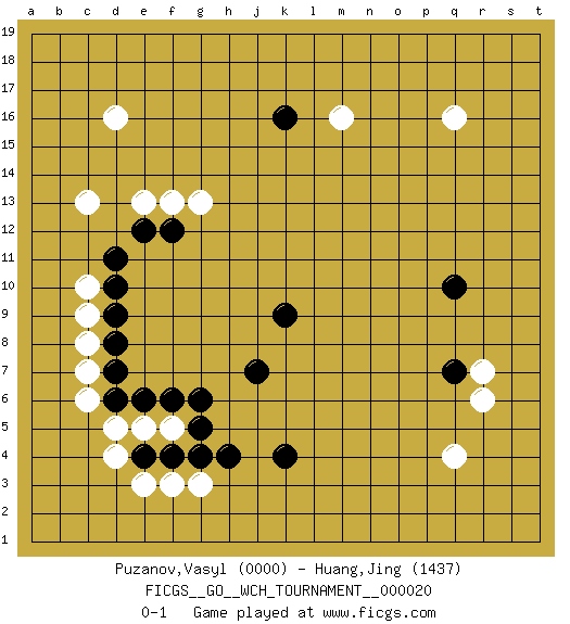 Last move : 0-1 2020 May 30 5:43:22 [Event "FICGS__GO__WCH_TOURNAMENT__000020"] [Site "FICGS"] [Date "2020.03.12"] [Round "1"] [Black "Puzanov,Vasyl"] [White "Huang,Jing"] [Result "0-1"] [Rating 1 "0000"] [Rating 2 "1437"] 1.k9 d4 2.k4 d16 3.d10 q4 4.q10 q16 5.k16 g3 6.g4 f3 7.j7 r7 8.q7 r6 9.e4 e3 10.f4 d5 11.d6 e5 12.e6 f5 13.h4 c13 14.f6 m16 15.g5 c6 16.g6 c7 17.d7 c8 18.d8 c9 19.d9 c10 20.d11 e13 21.f12 f13 22.e12 g13 0-1 This go game has been lost on time (started : 2020.03.12 0:52:28) Here are the names of the openings (joseki) played in the four corners : Player White won this Go (weiqi, baduk) game. Follow this game move after move (download)Error is one of the sources of transformation. (Pierre Audouard) The Movers & Shakers of this world are those who play chess in the mornings and go to the disco in the evenings. (Dinesh De Silva)