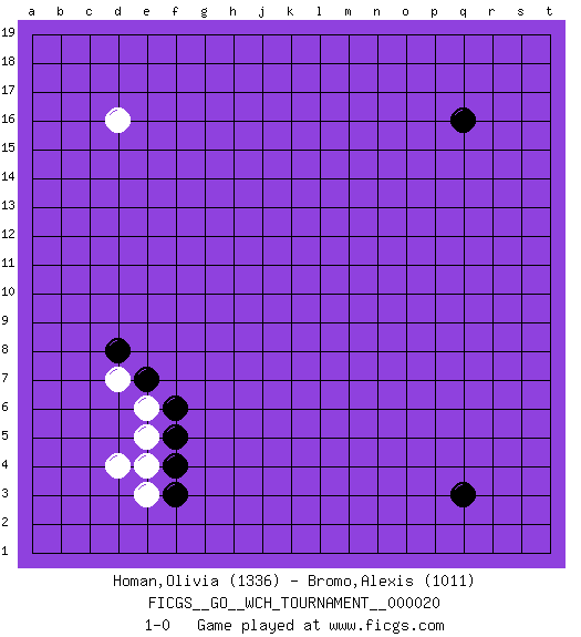 Last move : 1-0 2020 April 19 6:26:44 [Event "FICGS__GO__WCH_TOURNAMENT__000020"] [Site "FICGS"] [Date "2020.03.12"] [Round "1"] [Black "Homan,Olivia"] [White "Bromo,Alexis"] [Result "1-0"] [Rating 1 "1336"] [Rating 2 "1011"] 1.q16 d4 2.q3 d16 3.f3 e3 4.f4 e4 5.f5 e5 6.f6 e6 7.e7 d7 8.d8 1-0 This go game has been lost on time (started : 2020.03.12 0:52:28) Here are the names of the openings (joseki) played in the four corners : Corner d4 : d4 f3 Hoshi (Hwajeom, Seongjeom, Xingwei`) 4-4 Point. The star or hoshi (4-4) point, emphasizing influence at the potential expense of territory. Ikken Kakari (Hankan Keolch'im, Yi Gua`jiao~, 1-Space Low Approach). Black 2 is the standard approach move to the 4-4. Player Black won this Go (weiqi, baduk) game. Follow this game move after move (download)Don't defend - extend ! (Bill Taylor) No, no, you're not thinking; you're just being logical. (Niels Bohr)