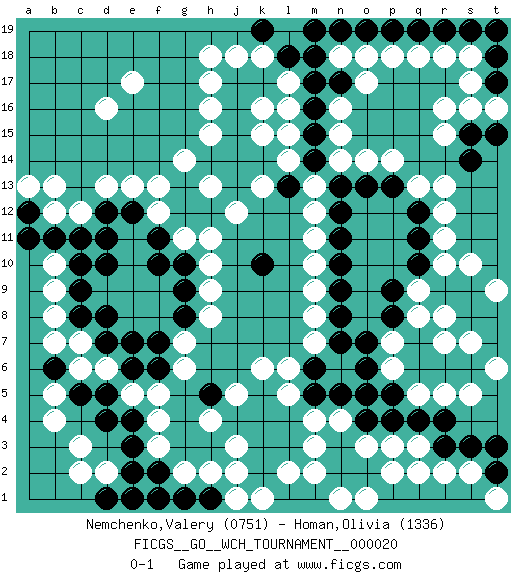Last move : 0-1 2020 April 21 8:18:9 [Event "FICGS__GO__WCH_TOURNAMENT__000020"] [Site "FICGS"] [Date "2020.03.12"] [Round "1"] [Black "Nemchenko,Valery"] [White "Homan,Olivia"] [Result "0-1"] [Rating 1 "0751"] [Rating 2 "1336"] 1.q4 d16 2.d4 r16 3.k10 c6 4.d10 f3 5.k4 e5 6.e4 f4 7.e3 b4 8.d5 d6 9.e6 f5 10.f2 g2 11.e1 d2 12.e2 c3 13.g1 h2 14.h1 j1 15.f1 j2 16.c5 b5 17.d1 c2 18.f6 g6 19.e7 g7 20.d7 c7 21.d8 o3 22.o4 n4 23.o5 p3 24.p4 q3 25.n5 m4 26.m5 l5 27.l4 l6 28.k5 k6 29.n3 m3 30.n2 m2 31.o2 p2 32.l3 l2 33.k2 k1 34.k3 j5 35.m6 m7 36.n7 m8 37.n8 m9 38.n9 m10 39.n10 m11 40.n11 m12 41.n12 r13 42.n13 r10 43.r3 r2 44.p1 q2 45.q1 n1 46.s3 s2 47.t2 r7 48.s1 o1 49.r1 t1 50.t3 r5 51.r4 c12 52.d12 d13 53.d11 e13 54.e12 f12 55.f11 g11 56.f10 h10 57.g10 h11 58.g9 h9 59.g8 h8 60.f7 m13 61.m14 l14 62.m15 l15 63.m16 l16 64.m17 l17 65.l18 k18 66.m19 n18 67.m18 o17 68.n19 p18 69.o19 o14 70.o13 p14 71.p13 q13 72.q12 r12 73.q11 r11 74.q10 q9 75.p9 q8 76.p8 p7 77.o7 p6 78.o6 s5 79.r9 r8 80.p5 e17 81.c11 b12 82.b11 b9 83.a12 a13 84.a11 b13 85.c8 b8 86.b6 b7 87.c9 b10 88.c10 n14 89.k17 j18 90.k19 h18 91.j17 h17 92.j16 h16 93.j15 h15 94.j14 k13 95.j13 j12 96.g12 f13 97.g13 g14 98.h14 h13 99.h12 h13 100.k14 k15 101.l13 k16 102.n17 o18 103.p19 q18 104.q19 r18 105.r19 s18 106.s19 n15 107.t18 s17 108.t17 t16 109.t19 n16 110.t15 s16 111.s15 r15 112.s14 q5 113.s9 s10 114.s8 s7 115.t7 t6 116.t8 t9 117.j4 h4 118.h5 j3 0-1 Here are the names of the openings (joseki) played in the four corners : Corner d4 : d4 c6 Hoshi (Hwajeom, Seongjeom, Xingwei`) 4-4 Point. The star or hoshi (4-4) point, emphasizing influence at the potential expense of territory. Ikken Kakari (Hankan Keolch'im, Yi Gua`jiao~, 1-Space Low Approach). White 2 is the standard approach move to the 4-4. Corner q4 : q4 o3 Hoshi (Hwajeom, Seongjeom, Xingwei`) 4-4 Point. The star or hoshi (4-4) point, emphasizing influence at the potential expense of territory. Ikken Kakari (Hankan Keolch'im, Yi Gua`jiao~, 1-Space Low Approach). White 2 is the standard approach move to the 4-4. Player White won this Go (weiqi, baduk) game. Follow this game move after move (download)When your opponent has two weak groups, attack them both at once. (Anonymous) I don't know, I don't care, and it doesn't make any difference. (Albert Einstein)