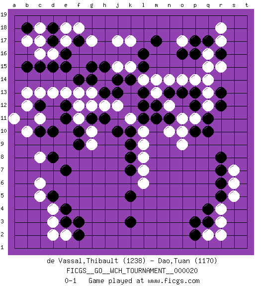 Last move : 0-1 2020 March 30 23:47:54 [Event "FICGS__GO__WCH_TOURNAMENT__000020"] [Site "FICGS"] [Date "2020.03.12"] [Round "1"] [Black "de Vassal,Thibault"] [White "Dao,Tuan"] [Result "0-1"] [Rating 1 "1238"] [Rating 2 "1170"] 1.q4 d3 2.q17 c16 3.e16 e17 4.d17 d16 5.f17 e18 6.d18 f18 7.b18 g17 8.e15 b17 9.d15 c18 10.c15 c17 11.d10 c6 12.k3 d13 13.e12 r3 14.q3 r4 15.r5 s5 16.r6 s6 17.r7 r15 18.r16 s7 19.r8 q15 20.r12 q12 21.q11 p11 22.q10 o17 23.p16 q16 24.p17 r17 25.o16 r18 26.p12 l8 27.k7 l7 28.k8 l9 29.k9 l6 30.k5 l10 31.k10 m13 32.m17 q13 33.l12 n10 34.m12 n12 35.n11 o11 36.m11 o9 37.p10 o10 38.p13 p14 39.r13 q14 40.o13 o14 41.n13 n14 42.l13 m14 43.e7 c8 44.e4 d4 45.e3 e2 46.d5 c5 47.f2 d2 48.f3 q2 49.p2 r2 50.p3 e13 51.g15 f12 52.e11 h14 53.g14 g13 54.h13 h12 55.j13 j12 56.j14 f11 57.f10 g10 58.f9 k11 59.l11 b13 60.b15 g9 61.j10 b10 62.c12 c13 63.b11 a11 64.c10 b12 65.f14 f13 66.h11 c11 67.g11 g12 68.d8 j15 69.h15 k15 70.l15 l14 71.k14 j17 72.l16 k17 0-1 Here are the names of the openings (joseki) played in the four corners : Corner d16 : c16 e16 Komoku (Somok, Xiao~mu`) 3-4 Point. The komoku (3-4) point is the traditional corner enclosure move.. Ikken Takagakari (Hankan Nop'dakeolch'im, Yi Gaogua`jiao~, 1-Space High Approach). The 5-4 approach move has become more popular in modern times, as modern Go emphasizes speed and influence. Corner q4 : q4 r3 Hoshi (Hwajeom, Seongjeom, Xingwei`) 4-4 Point. The star or hoshi (4-4) point, emphasizing influence at the potential expense of territory. Corner q16 : q17 r15 Komoku (Somok, Xiao~mu`) 3-4 Point. The komoku (3-4) point is the traditional corner enclosure move.. Ikken Kakari (Hankan Keolch'im, Yi Gua`jiao~, 1-Space Low Pincer). The small knight move is the basic approach move to the 3-4 point stone. It has been continually used for over four centuries. There are limitless variations, with new moves constantly being discovered. White 2 opens the door to a treaure store of joseki. Player White won this Go (weiqi, baduk) game. Follow this game move after move (download)The game plays itself, the players don't control it. (Pierre Audouard) Begin at the beginning and go on till you come to the end; then stop. (Lewis Carrol, Alice in Wonderland)