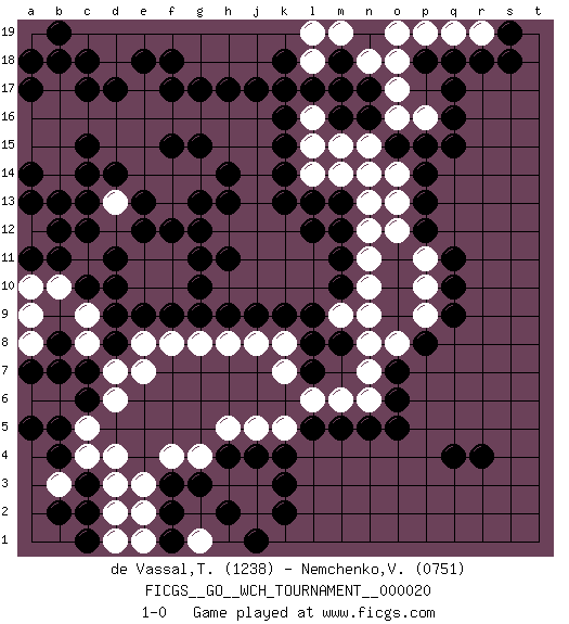 Last move : 1-0 2020 April 24 19:27:51 [Event "FICGS__GO__WCH_TOURNAMENT__000020"] [Site "FICGS"] [Date "2020.03.12"] [Round "1"] [Black "de Vassal,Thibault"] [White "Nemchenko,Valery"] [Result "1-0"] [Rating 1 "1238"] [Rating 2 "0751"] 1.q4 d16 2.q16 d4 3.f17 f16 4.d17 e16 5.c17 c16 6.b16 b15 7.d10 k10 8.c7 d7 9.d8 e7 10.c6 e8 11.e9 c8 12.d9 c9 13.c10 b10 14.b11 a9 15.b8 d6 16.k4 k5 17.j4 j5 18.h4 h5 19.f9 f8 20.g17 g16 21.h17 h16 22.j17 j16 23.g9 g8 24.h9 h8 25.q10 p10 26.q11 p11 27.k16 e17 28.e18 a16 29.k15 j15 30.k14 j14 31.k13 j13 32.q9 p9 33.l5 l6 34.m5 m6 35.p12 o12 36.p13 o13 37.p14 o14 38.n5 n6 39.p8 o8 40.o7 n8 41.o6 n7 42.o15 n14 43.l12 j12 44.r4 g4 45.g3 f4 46.f3 e3 47.b4 c5 48.b5 c4 49.q17 n15 50.n16 m15 51.m16 l15 52.c3 d3 53.c2 d2 54.j9 j8 55.k9 k8 56.g12 k11 57.l9 m9 58.e13 b17 59.b18 a18 60.c18 j10 61.b13 b14 62.c14 c13 63.c12 d13 64.d14 d12 65.d11 l10 66.m11 n11 67.m13 l14 68.l13 m14 69.m10 n10 70.c15 a13 71.b12 a12 72.a11 a10 73.a14 a15 74.a13 a8 75.a7 a6 76.b7 e14 77.e12 f14 78.g13 g14 79.h13 l11 80.m12 l16 81.l17 n13 82.m8 n9 83.l8 n12 84.h11 h10 85.g10 h12 86.h14 h15 87.f2 e2 88.l7 k7 89.c1 d1 90.f1 e1 91.o5 h3 92.h2 j3 93.k3 b3 94.b2 b6 95.a5 m17 96.n17 o16 97.p15 o17 98.m18 o18 99.p18 p19 100.q18 q19 101.r18 r19 102.s19 o19 103.s18 p16 104.q15 n18 105.m17 j2 106.k2 g1 107.j1 k12 108.k17 d15 109.f15 d13 110.c13 f13 111.f12 e15 112.f18 m19 113.b19 a19 114.a17 b16 115.a18 l18 116.k18 l19 117.g11 j11 118.g15 1-0 Here are the names of the openings (joseki) played in the four corners : Corner d16 : d16 f17 Hoshi (Hwajeom, Seongjeom, Xingwei`) 4-4 Point. The star or hoshi (4-4) point, emphasizing influence at the potential expense of territory. Ikken Kakari (Hankan Keolch'im, Yi Gua`jiao~, 1-Space Low Approach). Black 2 is the standard approach move to the 4-4. Corner d4 : d4 c7 Hoshi (Hwajeom, Seongjeom, Xingwei`) 4-4 Point. The star or hoshi (4-4) point, emphasizing influence at the potential expense of territory. Niken Kakari (Dukan Keolch'im, E`r Gua`jiao~, 2-Space Low Approach). White typically answers by 7-3 or 3-5 (which is not joseki). Player Black won this Go (weiqi, baduk) game. Follow this game move after move (download)Empty triangles are bad. (Anonymous) Wikichess, chess moves explained by 'experimented' players. (Thibault de Vassal)