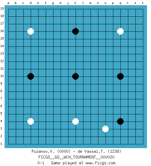 Last move : 0-1 2020 April 20 6:40:43 [Event "FICGS__GO__WCH_TOURNAMENT__000020"] [Site "FICGS"] [Date "2020.03.12"] [Round "1"] [Black "Puzanov,Vasyl"] [White "de Vassal,Thibault"] [Result "0-1"] [Rating 1 "0000"] [Rating 2 "1238"] 1.q10 d16 2.k10 d4 3.k16 q16 4.q4 k4 5.d10 o3 0-1 This go game has been lost on time (started : 2020.03.12 0:52:28) Here are the names of the openings (joseki) played in the four corners : Corner q4 : q4 o3 Hoshi (Hwajeom, Seongjeom, Xingwei`) 4-4 Point. The star or hoshi (4-4) point, emphasizing influence at the potential expense of territory. Ikken Kakari (Hankan Keolch'im, Yi Gua`jiao~, 1-Space Low Approach). White 2 is the standard approach move to the 4-4. Player White won this Go (weiqi, baduk) game. Follow this game move after move (download)Learn to play under the stones. (Anonymous) No enterprise is more likely to succeed than one concealed from the enemy until it is ripe for execution. (Niccolo Machiavelli)