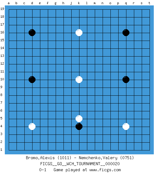 Last move : 0-1 2020 April 18 16:39:19 [Event "FICGS__GO__WCH_TOURNAMENT__000020"] [Site "FICGS"] [Date "2020.03.12"] [Round "1"] [Black "Bromo,Alexis"] [White "Nemchenko,Valery"] [Result "0-1"] [Rating 1 "1011"] [Rating 2 "0751"] 1.q16 d4 2.d16 q4 3.d10 k10 4.q10 k16 5.k4 k5 0-1 This go game has been lost on time (started : 2020.03.12 0:52:28) Here are the names of the openings (joseki) played in the four corners : Player White won this Go (weiqi, baduk) game. Follow this game move after move (download)Those who are good at winning, don't usually fight. (Zhang) My poor ole parrot... Is not in the circulation of displays ....poo hoo hoo :) (Wayne Lowrance's enigma)