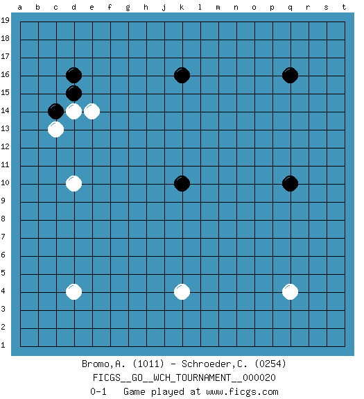 Last move : 0-1 2020 April 21 20:7:14 [Event "FICGS__GO__WCH_TOURNAMENT__000020"] [Site "FICGS"] [Date "2020.03.12"] [Round "1"] [Black "Bromo,Alexis"] [White "Schroeder,Christoph"] [Result "0-1"] [Rating 1 "1011"] [Rating 2 "0254"] 1.q16 d4 2.d16 q4 3.q10 d10 4.k16 k4 5.k10 e14 6.d15 d14 7.c14 c13 0-1 This go game has been lost on time (started : 2020.03.12 0:52:28) Here are the names of the openings (joseki) played in the four corners : Corner d16 : d16 e14 Hoshi (Hwajeom, Seongjeom, Xingwei`) 4-4 Point. The star or hoshi (4-4) point, emphasizing influence at the potential expense of territory. Corner d4 : d4 0-1 Hoshi (Hwajeom, Seongjeom, Xingwei`) 4-4 Point. The star or hoshi (4-4) point, emphasizing influence at the potential expense of territory. Player White won this Go (weiqi, baduk) game. Follow this game move after move (download)More haste less speed. (John Fairbairn) We're missing something. (Gregory House, House M.D.)