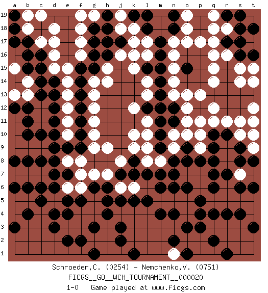 Last move : 1-0 2020 November 19 15:11:43 [Event "FICGS__GO__WCH_TOURNAMENT__000020"] [Site "FICGS"] [Date "2020.03.12"] [Round "1"] [Black "Schroeder,Christoph"] [White "Nemchenko,Valery"] [Result "1-0"] [Rating 1 "0254"] [Rating 2 "0751"] 1.d4 q16 2.q4 d16 3.q10 k10 4.o15 k16 5.d10 e10 6.e9 e11 7.d11 e12 8.d12 e13 9.d13 e14 10.d14 d15 11.c15 d17 12.c16 c17 13.b17 b18 14.a18 b19 15.a17 d18 16.a19 c19 17.b16 d9 18.d8 c9 19.c8 b9 20.b8 a10 21.b10 a9 22.b11 a11 23.a12 a13 24.b12 e8 25.f9 f8 26.a8 b13 27.c10 g9 28.f10 g10 29.f11 g11 30.f12 g12 31.f13 g13 32.f14 e15 33.f15 f16 34.g16 f17 35.g17 f18 36.g18 g19 37.h19 f19 38.h18 g14 39.g15 h14 40.c14 h15 41.h16 j16 42.q7 p10 43.m13 n13 44.n12 o13 45.r15 q15 46.r12 q12 47.r17 q17 48.r14 q14 49.m4 p11 50.q18 p17 51.q13 p13 52.r13 q11 53.m7 m8 54.h4 n14 55.l7 l8 56.m14 n15 57.g6 g7 58.r10 p9 59.n8 n9 60.h6 h7 61.k8 k9 62.m9 l9 63.m10 n10 64.l19 k17 65.j7 j8 66.m15 n16 67.k7 l10 68.m16 n17 69.m17 m18 70.l18 m19 71.n18 o18 72.n19 o19 73.m11 l11 74.l12 k12 75.p8 o8 76.n7 o12 77.n11 o11 78.m12 o7 79.o6 p7 80.q8 p6 81.p5 o5 82.n6 q5 83.p4 o4 84.q6 r5 85.r4 s5 86.s4 t4 87.t3 t5 88.s6 r6 89.r7 s7 90.t6 n5 91.o9 o10 92.o8 l13 93.o3 m5 94.l5 r11 95.q9 s11 96.s12 s10 97.s9 t9 98.t8 t10 99.s8 t12 100.t13 t11 101.n4 l14 102.l15 k15 103.p18 t14 104.s13 r16 105.s16 r18 106.s17 s15 107.p19 o17 108.r19 q19 109.s18 q18 110.s19 s14 111.t16 t15 112.t18 l17 113.j17 j18 114.h17 k18 115.k19 j19 116.d9 f6 117.f5 e6 118.e5 d7 119.d6 c7 120.c6 b7 121.b6 a7 122.a6 b5 123.b4 a5 124.c5 a4 125.a3 l16 126.e7 f7 127.d7 h9 128.m6 j6 129.j5 k6 130.k5 g5 131.h5 g4 132.g3 f4 133.e4 f3 134.f2 e3 135.d3 g2 136.e2 b14 137.b15 a15 138.c13 h2 139.j2 h3 140.j3 j1 141.k1 h1 142.g1 o2 143.n2 p2 144.q2 q1 145.r1 p1 146.p3 n1 147.o1 1-0 Follow this game move after move (download)In the opening, when you don't know what to play, make a shimari. (Jansteen) No, I am still playing. (Anatoly Karpov)