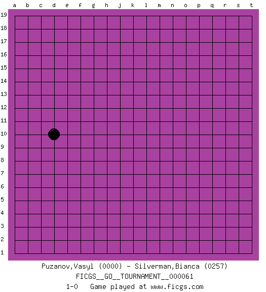 Last move : 1-0 2020 April 16 2:22:10 [Event "FICGS__GO__TOURNAMENT__000061"] [Site "FICGS"] [Date "2020.03.16"] [Round "1"] [Black "Puzanov,Vasyl"] [White "Silverman,Bianca"] [Result "1-0"] [Rating 1 "0000"] [Rating 2 "0257"] 1.d10 1-0 This go game has been lost on time (started : 2020.03.16 22:28:55) Here are the names of the openings (joseki) played in the four corners : Player Black won this Go (weiqi, baduk) game. Follow this game move after move (download)While the Baroque rules of chess could only have been created by humans, the rules of go are so elegant, organic, and rigorously logical that if intelligent life forms exist elsewhere in the universe, they almost certainly play go. (Edward Lasker, international chess master) There are two types of people in this world, good and bad. The good sleep better, but the bad seem to enjoy the waking hours much more. (Woody Allen)
