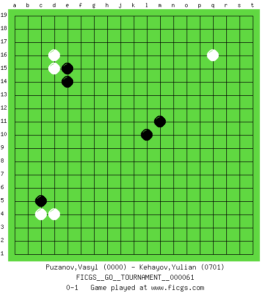 Last move : 0-1 2020 April 23 21:28:34 [Event "FICGS__GO__TOURNAMENT__000061"] [Site "FICGS"] [Date "2020.03.16"] [Round "1"] [Black "Puzanov,Vasyl"] [White "Kehayov,Yulian"] [Result "0-1"] [Rating 1 "0000"] [Rating 2 "0701"] 1.l10 q16 2.m11 d15 3.e15 d16 4.e14 c4 5.c5 d4 0-1 This go game has been lost on time (started : 2020.03.16 22:28:55) Here are the names of the openings (joseki) played in the four corners : Corner q16 : q16 m11 Hoshi (Hwajeom, Seongjeom, Xingwei`) 4-4 Point. The star or hoshi (4-4) point, emphasizing influence at the potential expense of territory. Corner d16 : d15 e15 Takamoku (Gomok, Gaomu`) 5-4 Point. The takamoku (high) point (5-4). With its emphasis on influence, the 5-4 point complements the 4-4 (hoshi) point in creating an influence-oriented fuseki. Corner d4 : c4 c5 Komoku (Somok, Xiao~mu`) 3-4 Point. The komoku (3-4) point is the traditional corner enclosure move.. Player White won this Go (weiqi, baduk) game. Follow this game move after move (download)Learning josekis by heart is useless if you don't try departing from them. (Pierre Audouard) That's absurd. I love it. (Gregory House, House M.D.)