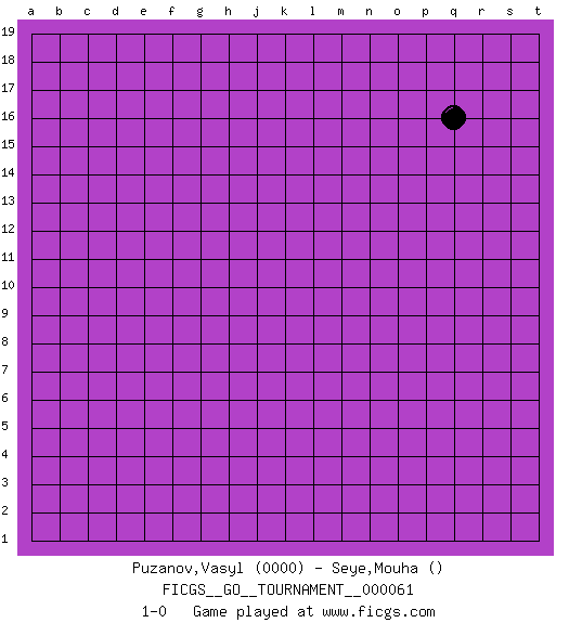 Last move : 1-0 2020 April 16 2:22:10 [Event "FICGS__GO__TOURNAMENT__000061"] [Site "FICGS"] [Date "2020.03.16"] [Round "1"] [Black "Puzanov,Vasyl"] [White "Seye,Mouha"] [Result "1-0"] [Rating 1 "0000"] 1.q16 1-0 This go game has been lost on time (started : 2020.03.16 22:28:55) Here are the names of the openings (joseki) played in the four corners : Player Black won this Go (weiqi, baduk) game. Follow this game move after move (download)Don't disturb symmetry. (Anonymous) Luck never made a man wise. (Seneca, Letters to Lucilius)