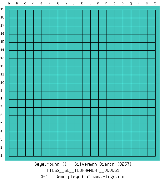 Last move : 0-1 2020 April 16 2:22:10 [Event "FICGS__GO__TOURNAMENT__000061"] [Site "FICGS"] [Date "2020.03.16"] [Round "1"] [Black "Seye,Mouha"] [White "Silverman,Bianca"] [Result "0-1"] [Rating 2 "0257"] 0-1 This go game has been lost on time (started : 2020.03.16 22:28:55) Here are the names of the openings (joseki) played in the four corners : Player White won this Go (weiqi, baduk) game. Follow this game move after move (download)Win the early ko to win the game. (Anonymous) Pushing plastic is for the many, pushing virtual pieces is for the fewer, pushing wood is for the very few. (Normajean Yates)