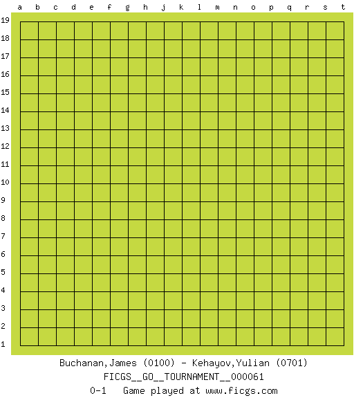 Last move : 0-1 2020 April 16 2:22:10 [Event "FICGS__GO__TOURNAMENT__000061"] [Site "FICGS"] [Date "2020.03.16"] [Round "1"] [Black "Buchanan,James"] [White "Kehayov,Yulian"] [Result "0-1"] [Rating 1 "0100"] [Rating 2 "0701"] 0-1 This go game has been lost on time (started : 2020.03.16 22:28:55) Here are the names of the openings (joseki) played in the four corners : Player White won this Go (weiqi, baduk) game. Follow this game move after move (download)Sacrifice for shape. (Anonymous) The only thing that matters is the evidence. (Horatio Caine, C.S.I. Miami)