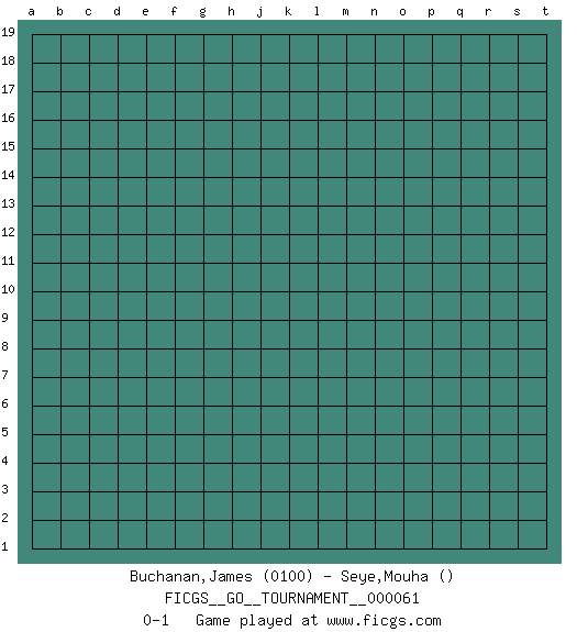Last move : 0-1 2020 April 16 2:22:10 [Event "FICGS__GO__TOURNAMENT__000061"] [Site "FICGS"] [Date "2020.03.16"] [Round "1"] [Black "Buchanan,James"] [White "Seye,Mouha"] [Result "0-1"] [Rating 1 "0100"] 0-1 This go game has been lost on time (started : 2020.03.16 22:28:55) Here are the names of the openings (joseki) played in the four corners : Player White won this Go (weiqi, baduk) game. Follow this game move after move (download)One point in the center is worth ten in the corner. (Anonymous) Knowledge rests not upon truth alone, but upon error also. (Carl G. Jung)