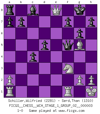 Last move : 1-0 2007 August 11 9:0:12 [Event "FICGS__CHESS__WCH_STAGE_1_GROUP_02__000003"] [Site "FICGS"] [Date "2007.07.11"] [Round "1"] [White "Schiller,Wilfried"] [Black "Serd,Than"] [Result "1-0"] [WhiteElo "2281"] [BlackElo "1310"] 1.d4 d5 2.c4 e6 3.Nc3 Nf6 4.cxd5 exd5 5.Bg5 Nbd7 6.e3 Bb4 7.Nf3 c5 8.Bd3 Qa5 9.O-O c4 10.Bf5 O-O 11.Qc2 g6 12.Bxd7 Nxd7 13.e4 Bxc3 14.bxc3 Re8 15.e5 Nb6 16.Nh4 Qa3 17.f4 Na4 18.f5 Qxc3 19.Qxa4 Qxd4+ 20.Kh1 Qxe5 21.Nf3 Qxf5 22.Qxe8+ 1-0 QGD : Exchange, positional line Kingside Castling by player White (move 9) Kingside Castling by player Black (move 10) Player White won this chess game. Follow this game move after move (download)When your house is on fire, you can't be bothered with the neighbors. Or, as we say in Chess, if your King is under attack you don't worry about losing a Pawn on the Queen's side. (Gary Kasparov) Viele Opfer benötigen überhaupt keine konkrete Berechnung. Es genügt sich die entstehende Position kurz vorzustellen, um uns davon zu überzeugen, dass das Opfer korrekt ist. (Mikhail Nekhemyevich Tal) El Ajedrez es un juego de pelea el cual es puramente intelectual e incluye la suerte. (Richard Reti) Les échecs sont un jeu par leur forme, un art par leur essence et une science par sa difficulté d'acquisition. Ils peuvent vous procurer autant de plaisir qu'un bon livre ou une belle musique, mais vous n'aurez une réelle joie que si vous arrivez à bien jouer. (Tigran Petrosian) The only thing that matters is the evidence. (Horatio Caine, C.S.I. Miami)