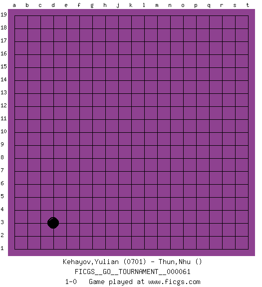 Last move : 1-0 2020 April 17 3:2:49 [Event "FICGS__GO__TOURNAMENT__000061"] [Site "FICGS"] [Date "2020.03.16"] [Round "1"] [Black "Kehayov,Yulian"] [White "Thun,Nhu"] [Result "1-0"] [Rating 1 "0701"] 1.d3 1-0 This go game has been lost on time (started : 2020.03.16 22:28:55) Here are the names of the openings (joseki) played in the four corners : Corner d4 : d3 1-0 Komoku (Somok, Xiao~mu`) 3-4 Point. The komoku (3-4) point is the traditional corner enclosure move.. Player Black won this Go (weiqi, baduk) game. Follow this game move after move (download)Play slow, win slow; play fast, lose fast. (Anonymous) Beta. Software undergoes beta testing shortly before it's released. Beta is latin for still doesn't work. (Anonymous)
