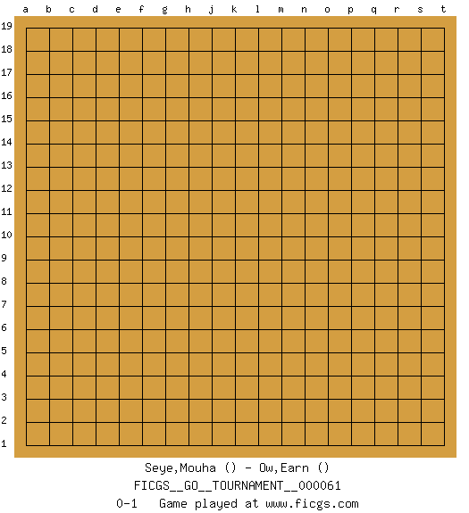 Last move : 0-1 2020 April 16 2:22:10 [Event "FICGS__GO__TOURNAMENT__000061"] [Site "FICGS"] [Date "2020.03.16"] [Round "1"] [Black "Seye,Mouha"] [White "Ow,Earn"] [Result "0-1"] 0-1 This go game has been lost on time (started : 2020.03.16 22:28:55) Here are the names of the openings (joseki) played in the four corners : Player White won this Go (weiqi, baduk) game. Follow this game move after move (download)To emphasize the lack of determination in his moves, one speaks of chance. (Pierre Audouard) Without enthusiasm, virtue functions not at all, and vice only poorly. (Mignon McLaughlin, The Neurotic's Notebook, 1960)