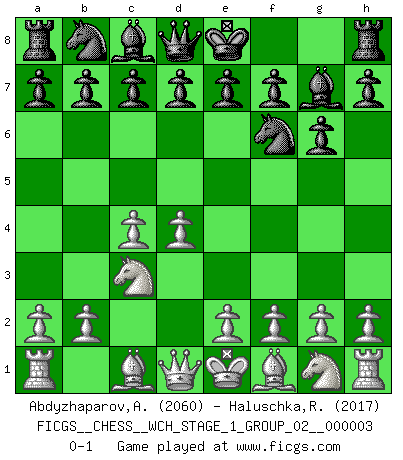 Last move : 0-1 2007 September 9 7:33:35 [Event "FICGS__CHESS__WCH_STAGE_1_GROUP_02__000003"] [Site "FICGS"] [Date "2007.07.11"] [Round "1"] [White "Abdyzhaparov,Aydar"] [Black "Haluschka,Rainer"] [Result "0-1"] [WhiteElo "2060"] [BlackElo "2017"] 1.d4 Nf6 2.c4 g6 3.Nc3 Bg7 0-1 This chess game has been lost on time (started : 2007.07.11 16:50:31) King's Indian defense, 3.Nc3 Player Black won this chess game. Follow this game move after move (download)In Chess, as it is played by masters, chance is practically eliminated. (Emanuel Lasker) Wenn Spassky eine Figur opfert kannst du genauso gut aufgeben. Aber wenn Tal eine Figur opfert, spiel weiter. Er könnte noch eine weitere opfern, und dann ... wer weiß? (Miguel Najdorf) Bendita sea la memoria de aquel que dio al mundo este juego inmortal. (A. G. Gardiner) On n'a jamais que l'âge auquel on a commence à jouer aux échecs car après on cesse de vieillir. (Capablanca) Real knowledge is to know the extent of one's ignorance. (Confucius)