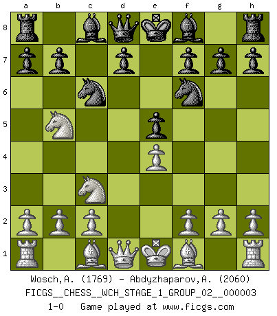 Last move : 1-0 2007 August 28 5:58:45 [Event "FICGS__CHESS__WCH_STAGE_1_GROUP_02__000003"] [Site "FICGS"] [Date "2007.07.11"] [Round "1"] [White "Wosch,Arkadiusz"] [Black "Abdyzhaparov,Aydar"] [Result "1-0"] [WhiteElo "1769"] [BlackElo "2060"] 1.e4 c5 2.Nf3 Nc6 3.d4 cxd4 4.Nxd4 Nf6 5.Nc3 e5 6.Ndb5 1-0 This chess game has been lost on time (started : 2007.07.11 16:50:31) Sicilian : Pelikan (Lasker/Sveshnikov) variation Player White won this chess game. Follow this game move after move (download)Chess opens and enriches your mind. (Saudin Robovic) Über Frauen: Chess is better. (Robert James Fischer) Un entendimiento minucioso de las típicas continuaciones de mate hacen de las mas complicadas combinaciones de sacrificio que conducen hacia ellas no solo no dificiles, sino casi un asunto de rutina. (Siegbert Tarrasch) Il n'y a plus de joueurs du niveau de Jacob Murray dont la seule quête est le beau jeu, le plaisir de voir les pièces construire quelque chose. Sur 10 idées à la minute, 9 seront sans intérêt, la dernière s'avèrera géniale. (Christian Bauer) If you don't practice you don't deserve to win. (Andre Agassi)