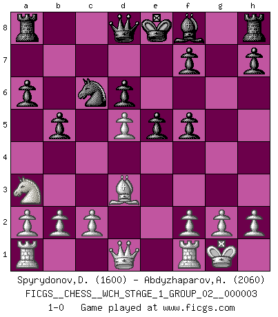 Last move : 1-0 2007 August 26 11:42:21 [Event "FICGS__CHESS__WCH_STAGE_1_GROUP_02__000003"] [Site "FICGS"] [Date "2007.07.11"] [Round "1"] [White "Spyrydonov,Dmitry"] [Black "Abdyzhaparov,Aydar"] [Result "1-0"] [WhiteElo "1600"] [BlackElo "2060"] 1.e4 c5 2.Nf3 Nc6 3.d4 cxd4 4.Nxd4 Nf6 5.Nc3 e5 6.Ndb5 d6 7.Bg5 a6 8.Na3 b5 9.Bxf6 gxf6 10.Nd5 f5 11.Bd3 Be6 12.O-O Bxd5 13.exd5 1-0 This chess game has been lost on time (started : 2007.07.11 16:50:31) Sicilian : Pelikan (Lasker/Sveshnikov) variation Kingside Castling by player White (move 12) Player White won this chess game. Follow this game move after move (download)There are two types of sacrifices: correct ones and mine. (Mikhail Tal) Gewöhnliche Menschen denken nur daran, wie sie ihre Zeit verbringen. Ein intelligenter Mensch versucht, sie auszunutzen. (Arthur Schopenhauer) Siempre es mejor sacrificar los hombres de tu oponente. (Savielly Tartakower) La vérité est comme le meilleur coup aux échecs : elle existe, mais il faut la chercher. (Arturo Perez-Reverte) The general who wins the battle makes many calculations in his temple before the battle is fought. The general who loses makes but few calculations beforehand. (Sun Tzu)
