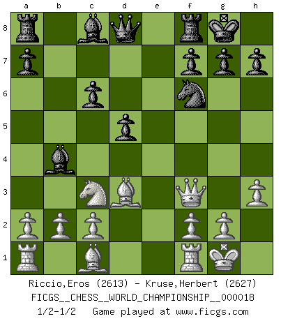 Last move : 1/2-1/2 2020 March 22 20:17:55 [Event "FICGS__CHESS__WORLD_CHAMPIONSHIP__000018"] [Site "FICGS"] [Date "2020.03.17"] [Round "1"] [White "Riccio,Eros"] [Black "Kruse,Herbert"] [Result "1/2-1/2"] [WhiteElo "2613"] [BlackElo "2627"] 1.e4 e5 2.Nf3 Nc6 3.Nc3 Nf6 4.d4 exd4 5.Nxd4 Bb4 6.Nxc6 bxc6 7.Bd3 d5 8.exd5 O-O 9.O-O cxd5 10.h3 c6 11.Qf3 1/2-1/2 Four knights : Scotch, 4...exd4 Kingside Castling by player Black (move 8) Kingside Castling by player White (move 9) This chess game ended in a draw. Follow this game move after move (download)Though most people love to look at the games of the great attacking masters, some of the most successful players in history have been the quiet positional players. They slowly grind you down by taking away your space, tying up your pieces, and leaving you with virtually nothing to do ! (Yasser Seirawan) Sitze auf Deine Hände. (Siegbert Tarrasch) Los Peones son nacidos libres, y aún así, se encuentran por doquier encadenados. (Rick Kennedy) Le succès, c'est être capable d'aller d'échec en échec sans perdre son enthousiasme. (Winston Churchill) Yoga is 99% practice and 1% knowledge. (Sri Krishna Pattabhi Jois)