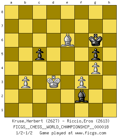 Last move : 1/2-1/2 2020 May 21 0:34:36 [Event "FICGS__CHESS__WORLD_CHAMPIONSHIP__000018"] [Site "FICGS"] [Date "2020.03.17"] [Round "2"] [White "Kruse,Herbert"] [Black "Riccio,Eros"] [Result "1/2-1/2"] [WhiteElo "2627"] [BlackElo "2613"] 1.Nf3 c5 2.c4 Nf6 3.g3 d5 4.cxd5 Nxd5 5.Bg2 Nc6 6.Nc3 g6 7.h4 Bg7 8.h5 Bf5 9.h6 Bf6 10.O-O O-O 11.Nh2 Nc7 12.d3 Qd7 13.Ne4 Bxe4 14.dxe4 Qxd1 15.Rxd1 Rad8 16.Re1 Nb4 17.Rb1 b6 18.Bf4 Ne6 19.e5 Bh8 20.Nf3 f6 21.a3 Nc2 22.Red1 Ncd4 23.Nxd4 Nxd4 24.e3 Ne2+ 25.Kf1 Nxf4 26.exf4 e6 27.Rxd8 Rxd8 28.Re1 Kf7 29.a4 Rd4 30.Bc6 g5 31.fxg5 fxg5 32.Be4 Bxe5 33.Bxh7 Bf6 34.b3 Rd2 35.Re2 Rxe2 36.Kxe2 a6 37.Bd3 b5 38.axb5 axb5 39.Bxb5 Kg6 40.Bc4 Kxh6 41.Bxe6 Bd4 42.f3 Kg6 43.Kd3 Bf2 44.g4 1/2-1/2 Reti Opening Kingside Castling by player White (move 10) Kingside Castling by player Black (move 10) 10 pieces endgame at move 40 : White KBPPP , Black KBPPP WHITE : King + 1 Bishop 3 Pawns BLACK : King + 1 Bishop 3 Pawns 9 pieces endgame at move 41 : White KBPPP , Black KBPP WHITE : King + 1 Bishop 3 Pawns BLACK : King + 1 Bishop 2 Pawns This chess game ended in a draw. Follow this game move after move (download)It's always better to sacrifice your opponent's men. (Savielly Tartakover) Ich tröste mich mit dem Vergnügen, daß Schachfans, Zuschauer und Leser glücklich sind, wenn ein Großmeister etwas riskiert, statt nur Klötzchen zu schieben. (Mikhail Nekhemyevich Tal) Un jugador que trata de regresar una movida en el Ajedrez es un futuro carterista. (Richard Fenton) Horreur, mais aussi harmonie suprême : qu'y avait-il en effet au monde en dehors des échecs ? Le brouillard, l'inconnu, le non-être... (Vladimir Nabokov) Bobby never cared about money, though. His only desire was to prove that his choices were correct: He wanted chess to be important because he was a chess player, and he wanted to be important. Bobby knew money was important, but he didn't have a clue why, outside of clothes and status. The only way he could accomplish what he wanted was to fight for a lot of money. Once he got it, he gave it away. He did not know how to spend it. And once he'd become champion, after, essentially, sacrificing his life for it, he didn't know how to spend his time. (Bob Wade)