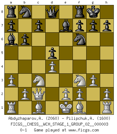 Last move : 0-1 2007 August 20 10:31:22 [Event "FICGS__CHESS__WCH_STAGE_1_GROUP_02__000003"] [Site "FICGS"] [Date "2007.07.11"] [Round "1"] [White "Abdyzhaparov,Aydar"] [Black "Pilipchuk,Andrey"] [Result "0-1"] [WhiteElo "2060"] [BlackElo "1600"] 1.d4 Nf6 2.c4 e6 3.Nf3 b6 4.a3 Ba6 5.Qc2 d5 6.cxd5 exd5 7.Nc3 Be7 8.g3 O-O 0-1 This chess game has been lost on time (started : 2007.07.11 16:50:31) Queen's Indian : Petrosian system Kingside Castling by player Black (move 8) Player Black won this chess game. Follow this game move after move (download)It is not a move, even the best move that you must seek, but a realizable plan. (Eugene Znosko-Borovsky) Obwohl ich vom Stil her kaum zu den Priestern der Schachkunst gezählt werde, halte ich Schach doch für eine Kunst. (Tigran Petrosjan) Una buena ofensiva y una buena defensa, comienzan ambas con un buen desarrollo. (Bruce A. Moon) J'ai vu le vaincu d'Echecs jouer des années durant dans l'espoir de la fête de la victoire. Car tu es plus riche de ce qu'elle existe si même elle n'est point pour toi. Ainsi de la perle du fond des mers. (Antoine de Saint-Exupéry) Man is still the most extraordinary computer of all. (John F. Kennedy)