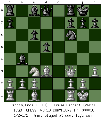 Last move : 1/2-1/2 2020 March 22 20:18:31 [Event "FICGS__CHESS__WORLD_CHAMPIONSHIP__000018"] [Site "FICGS"] [Date "2020.03.17"] [Round "5"] [White "Riccio,Eros"] [Black "Kruse,Herbert"] [Result "1/2-1/2"] [WhiteElo "2613"] [BlackElo "2627"] 1.e4 e5 2.Nf3 Nc6 3.Nc3 Nf6 4.d4 exd4 5.Nxd4 Bb4 6.Nxc6 bxc6 7.Bd3 d5 8.exd5 O-O 9.O-O cxd5 10.h3 c6 11.Qf3 1/2-1/2 Four knights : Scotch, 4...exd4 Kingside Castling by player Black (move 8) Kingside Castling by player White (move 9) This chess game ended in a draw. Follow this game move after move (download)I'm not afraid of Spassky. The world knows I'm the best. You don't need a match to prove it. (Bobby Fischer) Am wohlsten fühle ich mich, wenn ich sehe, wie sich mein Gegner im Todeskampf windet. (Robert James Fischer) Bobby Fischer es el mas grande genio de Ajedrez de todos los tiempos. (Alexander Kotov) On est toujours la mazette de quelqu'un d'autre. (Anonyme) Luck never made a man wise. (Seneca, Letters to Lucilius)