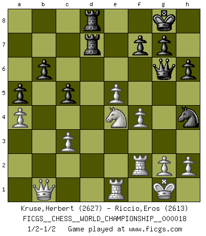 Last move : 1/2-1/2 2020 May 16 22:15:43 [Event "FICGS__CHESS__WORLD_CHAMPIONSHIP__000018"] [Site "FICGS"] [Date "2020.03.17"] [Round "8"] [White "Kruse,Herbert"] [Black "Riccio,Eros"] [Result "1/2-1/2"] [WhiteElo "2627"] [BlackElo "2613"] 1.d4 d5 2.c4 dxc4 3.e4 e5 4.Nf3 Bb4+ 5.Nc3 exd4 6.Nxd4 Nd7 7.Bxc4 Ngf6 8.f3 O-O 9.Be2 Ne5 10.O-O Qe7 11.Bg5 Bxc3 12.bxc3 c5 13.Nb3 Rd8 14.Qb1 b6 15.f4 Ng6 16.Rf2 h6 17.Bxf6 Qxf6 18.Qc1 a5 19.e5 Qf5 20.Qe3 Ne7 21.Re1 Rb8 22.Bb5 Qg6 23.a4 Nd5 24.Qc1 Bd7 25.Bxd7 Rxd7 26.Nd2 Ne7 27.Ne4 Rbd8 28.Qb1 Nf5 29.Rb2 Nh4 30.Rf2 1/2-1/2 QGA : 3.e4 Kingside Castling by player Black (move 8) Kingside Castling by player White (move 10) This chess game ended in a draw. Follow this game move after move (download)Chess is the gymnasium of the mind. (Blaise Pascal) Gott hat gewollt, dass ich Champion werde. (Surab Azmajparaschvili) Aquellos que dicen entender al Ajedrez, no entienden nada. (Robert Hubner) La solitude du joueur d'Echecs à l'approche du mat est semblable à celle du condamné. (Francis Szpiner) Dave, my mind is going. I can feel it. (HAL 9000 in 2001, a space odyssey)