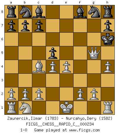 Last move : 1-0 2020 April 12 4:53:4 [Event "FICGS__CHESS__RAPID_C__000234"] [Site "FICGS"] [Date "2020.03.18"] [Round "1"] [White "Zaunercik,Ilmar"] [Black "Nurcahyo,Dery"] [Result "1-0"] [WhiteElo "1783"] [BlackElo "1582"] 1.e4 e5 2.Nf3 f6 3.Nxe5 fxe5 4.Qh5+ Ke7 5.Qxe5+ Kf7 6.Bc4+ Kg6 7.Qf5+ Kh6 8.d4 g5 9.h4 d5 10.Bxg5+ Qxg5 11.Qxg5+ 1-0 Damiano's defense Player White won this chess game. Follow this game move after move (download)There just isn't enough televised Chess. (David Letterman) Der 70jährige Viktor Kortschnoi: Die Rentenanstalt wollte mich zwingen in Rente zu gehen. Meine Frau erhält jetzt eine Pension- und ich zahle weiter in die Rentenkasse ein! (Viktor Kortschnoi) En un gambito tu regalas un Peón por el bién de tomar un juego perdido. (Samuel Standige Boden) Le plus grand jeu de l'esprit jamais inventé, plus vous l'apprenez, plus vous y prenez du plaisir. (Garry Kasparov) The Movers & Shakers of this world are those who play chess in the mornings and go to the disco in the evenings. (Dinesh De Silva)