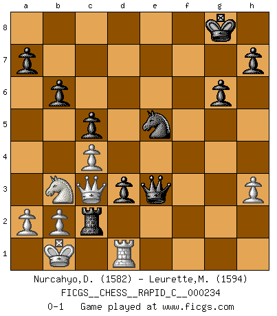 Last move : 0-1 2020 May 27 23:31:25 [Event "FICGS__CHESS__RAPID_C__000234"] [Site "FICGS"] [Date "2020.03.18"] [Round "1"] [White "Nurcahyo,Dery"] [Black "Leurette,Marc-Antoine"] [Result "0-1"] [WhiteElo "1582"] [BlackElo "1594"] 1.e4 e5 2.Ne2 Nf6 3.d3 Nc6 4.c3 Be7 5.Be3 d6 6.Ng3 O-O 7.h3 b6 8.Be2 Bb7 9.Bg4 Nxg4 10.Qxg4 g6 11.Nd2 Bc8 12.Qd1 f5 13.exf5 Bxf5 14.Qb3+ d5 15.d4 Bd3 16.dxe5 Nxe5 17.O-O-O c5 18.c4 d4 19.Bh6 Rxf2 20.Rhg1 Bg5 21.Bxg5 Qxg5 22.Ngf1 Bxf1 23.Rgxf1 Rxg2 24.Qc2 Rf8 25.Rxf8+ Kxf8 26.Kb1 d3 27.Qc1 Qe3 28.Qc3 Kg8 29.Nb3 Rc2 0-1 Alapin's Opening Kingside Castling by player Black (move 6) Queenside Castling by player White (move 17) Player Black won this chess game. Follow this game move after move (download)Chess is life. (Bobby Fischer) Ein Kibitz ist einer, der deinem Gegner gute Ratschläge gibt. (Andrew Soltis) Botvinnik trataba de restarle el misterio al Ajedrez, siempre relacionandolo a situaciones de la vida ordinaria. El gustaba de llamar al Ajedrez un típico problema inexacto similar a aquellos de los cuales la gente siempre tiene que enfrentarse en la vida cotidiana. (Garry Kasparov) Si je n'étais pas joueur d'échecs, je serais le meilleur dans quelque chose d'autre. (Anatoli Karpov) I find your interest interesting. (Gregory House, House M.D.)