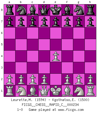 Last move : 1-0 2020 April 17 15:33:35 [Event "FICGS__CHESS__RAPID_C__000234"] [Site "FICGS"] [Date "2020.03.18"] [Round "1"] [White "Leurette,Marc-Antoine"] [Black "Kgothatso,Elton"] [Result "1-0"] [WhiteElo "1594"] [BlackElo "1500"] 1.e4 1-0 This chess game has been lost on time (started : 2020.03.18 10:45:29) King's pawn Opening Player White won this chess game. Follow this game move after move (download)The Pin is mightier than the sword. (Fred Reinfeld) Ich tröste mich mit dem Vergnügen, daß Schachfans, Zuschauer und Leser glücklich sind, wenn ein Großmeister etwas riskiert, statt nur Klötzchen zu schieben. (Mikhail Nekhemyevich Tal) Si pudieramos observar el interior de la cabeza de un jugador de Ajedrez, encontraríamos ahí un mundo lleno de sentimientos, imágenes, ideas, emoción y pasión. (Alfred Binet) À la honte des hommes, on sait que les lois du jeu sont les seules qui soient partout justes, claires, inviolables et exécutées. Pourquoi l'Indien qui a donné les règles du jeu d'échecs est-il obéi de bon gré dans toute la terre, et que les décrétales des papes, par exemple, sont aujourd'hui un objet d'horreur et de mépris ? C'est que l'inventeur des échecs combina tout avec justesse pour la satisfaction des joueurs, et que les papes, dans leurs décrétales, n'eurent en vue que leur seul avantage. L'Indien voulut exercer également l'esprit des hommes et leur donner du plaisir; les papes ont voulu abrutir l'esprit des hommes. Voltaire (Dictionnaire philosophique / Garnier 1967) Wikichess, chess moves explained by 'experimented' players. (Thibault de Vassal)