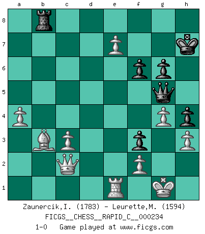 Last move : 1-0 2020 April 6 18:19:50 [Event "FICGS__CHESS__RAPID_C__000234"] [Site "FICGS"] [Date "2020.03.18"] [Round "1"] [White "Zaunercik,Ilmar"] [Black "Leurette,Marc-Antoine"] [Result "1-0"] [WhiteElo "1783"] [BlackElo "1594"] 1.e4 e5 2.Nf3 Nc6 3.Bb5 a6 4.Ba4 b5 5.Bb3 Bc5 6.O-O Nf6 7.d3 O-O 8.Bg5 h6 9.Bh4 d6 10.Nbd2 Bb7 11.c3 Qe7 12.Re1 Nd8 13.Bg3 Ne6 14.h3 Nh5 15.Bh2 Bb6 16.Nf1 c5 17.Ne3 a5 18.Nf5 Qd7 19.Nxe5 dxe5 20.Qxh5 Bc7 21.Nh4 c4 22.dxc4 a4 23.Bc2 bxc4 24.Rad1 Qe7 25.Nf5 Qg5 26.Qe2 a3 27.bxa3 Rxa3 28.Qxc4 Ba6 29.Qc6 Bc8 30.Bb3 Ra6 31.Qc4 f6 32.Qxc7 Kh7 33.Qc4 Ra8 34.Rd6 Nf4 35.Bxf4 exf4 36.Qd3 Bxf5 37.exf5 h5 38.a4 Rab8 39.Qc2 f3 40.g3 h4 41.g4 Rfe8 42.Rde6 Rxe6 43.fxe6 g6 44.e7 1-0 Ruy Lopez : Graz variation Kingside Castling by player White (move 6) Kingside Castling by player Black (move 7) Player White won this chess game. Follow this game move after move (download)It is no time to be playing Chess when the house is on fire. (Italian Proverb) Die Partien sind immer verschieden, die Interviews immer die gleichen. (Garry Kasparov) Solo el jugador con la iniciativa tiene el derecho a atacar. (Wilhelm Steinitz) Les sacrifices démontrent seulement que quelqu'un a gaffé. (Savielly Tartacover) A good player is always lucky. (Capablanca)