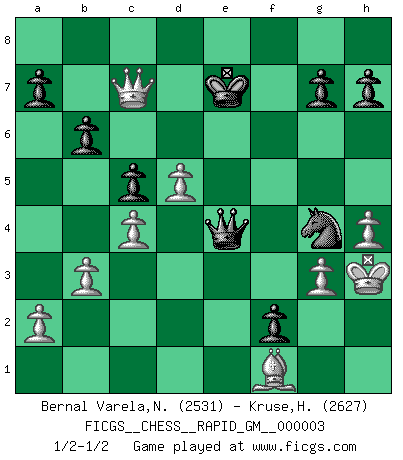 Last move : 1/2-1/2 2020 May 10 18:47:33 [Event "FICGS__CHESS__RAPID_GM__000003"] [Site "FICGS"] [Date "2020.03.18"] [Round "1"] [White "Bernal Varela,Nelson"] [Black "Kruse,Herbert"] [Result "1/2-1/2"] [WhiteElo "2531"] [BlackElo "2627"] 1.d4 Nf6 2.c4 c6 3.Nf3 d5 4.e3 e6 5.b3 b6 6.Bb2 Nbd7 7.Bd3 Bd6 8.O-O Bb7 9.Nbd2 O-O 10.Qe2 Qe7 11.Rad1 Rad8 12.e4 dxe4 13.Nxe4 Nxe4 14.Qxe4 f5 15.Qe3 c5 16.Ng5 e5 17.d5 f4 18.Qh3 Qxg5 19.Qe6+ Rf7 20.Qxd6 f3 21.g3 Re8 22.Rfe1 Rfe7 23.h4 Qh5 24.Bf1 Qf5 25.Qc7 Nf6 26.Rxe5 Rxe5 27.Bxe5 Rxe5 28.Qxb7 Qc2 29.Rd3 Re1 30.Re3 Rxe3 31.fxe3 f2+ 32.Kh2 Ng4+ 33.Kh3 Qf5 34.Qb8+ Kf7 35.Qc7+ Ke8 36.e4 Qxe4 37.Qc8+ Ke7 38.Qc7+ 1/2-1/2 Queen's pawn game Kingside Castling by player White (move 8) Kingside Castling by player Black (move 9) This chess game ended in a draw. Follow this game move after move (download)The battle for the ultimate truth will never be won. And that's why Chess is so fascinating. (Hans Kmoch) Ich glaube, ich kenne inzwischen die Gründe für mein Versagen: schachliche Charakterfehler. Ich war nie ein Wunderkind und in meiner gesamten menschlichen Entwicklung immer zu langsam. (Viktor Kortschnoi) Yo no le temo a Spassky. Todos saben que yo soy el mejor. Uno no necesita un torneo para probarlo. (Bobby Fischer) Si rien de grave n'est détecté lors de l'analyse d'une position, on joue alors le coup. Seconde règle de Blumenfeld. There's always a bigger fish. (Qui-Gon Jinn in Star Wars ep.1)