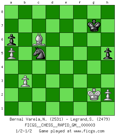 Last move : 1/2-1/2 2020 August 25 18:24:5 [Event "FICGS__CHESS__RAPID_GM__000003"] [Site "FICGS"] [Date "2020.03.18"] [Round "1"] [White "Bernal Varela,Nelson"] [Black "Legrand,Stephane"] [Result "1/2-1/2"] [WhiteElo "2531"] [BlackElo "2479"] 1.d4 Nf6 2.c4 e6 3.g3 d5 4.Nf3 Be7 5.Bg2 O-O 6.O-O dxc4 7.Qc2 a6 8.a4 Bd7 9.Qxc4 Bc6 10.Bf4 Bd6 11.Rd1 Bxf4 12.gxf4 Bd5 13.Qd3 Nc6 14.a5 Nb4 15.Qd2 Qe7 16.Nc3 Ne4 17.Qc1 f6 18.Nxd5 Nxd5 19.Qc2 Nd6 20.e3 c6 21.Kh1 Kh8 22.Rg1 Nb4 23.Qa4 Ne4 24.Rgf1 Nd5 25.Qc2 Nd6 26.Rg1 Nb4 27.Qd2 Nd5 28.Rad1 Rad8 29.Qc2 Nb4 30.Qb3 Ne4 31.Rgf1 Nd5 32.Ne1 Nd6 33.Nd3 g5 34.fxg5 fxg5 35.Rg1 Rf7 36.Rde1 Rg8 37.f3 h5 38.Ne5 Rfg7 39.Qa3 Nb4 40.Qc3 Nd5 41.Qc5 Qd8 42.Bh3 g4 43.fxg4 Nf6 44.g5 Nfe4 45.Qc2 Rxg5 46.Rxg5 Qxg5 47.Nf7+ Nxf7 48.Qxe4 Rg6 49.Rf1 Nd6 50.Qe5+ Qxe5 51.dxe5 Nc4 52.Rf6 Rg5 53.Bxe6 Nxe3 54.Bc8 Rxe5 55.Re6 Rxe6 56.Bxe6 Nd1 57.b3 Kg7 58.Bc8 Nf2+ 59.Kg2 Ne4 60.Bxb7 Nc5 61.Bxc6 1/2-1/2 Catalan Opening Kingside Castling by player Black (move 5) Kingside Castling by player White (move 6) 10 pieces endgame at move 60 : White KBPPP , Black KNPPP WHITE : King + 1 Bishop 3 Pawns BLACK : King + 1 Knight 3 Pawns 9 pieces endgame at move 61 : White KBPPP , Black KNPP WHITE : King + 1 Bishop 3 Pawns BLACK : King + 1 Knight 2 Pawns This chess game ended in a draw. Follow this game move after move (download)A passed Pawn increases in strength as the number of pieces on the board diminishes. (Capablanca) Obwohl ich vom Stil her kaum zu den Priestern der Schachkunst gezählt werde, halte ich Schach doch für eine Kunst. (Tigran Petrosjan) Botvinnik trataba de restarle el misterio al Ajedrez, siempre relacionandolo a situaciones de la vida ordinaria. El gustaba de llamar al Ajedrez un típico problema inexacto similar a aquellos de los cuales la gente siempre tiene que enfrentarse en la vida cotidiana. (Garry Kasparov) Aucun coup ne doit être joué sans but. (Pedro Damiano) The absolute truth is the thing that makes people laugh. (Carl Reiner)