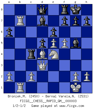 Last move : 1/2-1/2 2020 April 25 18:48:25 [Event "FICGS__CHESS__RAPID_GM__000003"] [Site "FICGS"] [Date "2020.03.18"] [Round "1"] [White "Broniek,Mariusz Maciej"] [Black "Bernal Varela,Nelson"] [Result "1/2-1/2"] [WhiteElo "2450"] [BlackElo "2531"] 1.d4 e6 2.e4 d5 3.Nc3 Nf6 4.e5 Nfd7 5.f4 c5 6.Nf3 cxd4 7.Nxd4 Nc6 8.Be3 Qb6 9.Qd2 Qxb2 10.Rb1 Qa3 11.Bb5 Nxd4 12.Bxd4 a6 13.Bxd7+ Bxd7 14.Rb3 Qe7 15.Rxb7 Rc8 16.O-O Qd8 17.Qe3 Rc4 18.Rfb1 Be7 19.f5 Bg5 20.Qd3 O-O 21.Ne4 1/2-1/2 Queen's pawn Kingside Castling by player White (move 16) Kingside Castling by player Black (move 20) This chess game ended in a draw. Follow this game move after move (download)Man is a frivolous, a specious creature, and like a Chess player, cares more for the process of attaining his goal than for the goal itself. (Dostoyevsky) Wenn Dein Gegner dir ein Remis anbietet, versuch herauszufinden, weshalb er glaubt schlechter zu stehen. (Nigel Short) Tu eres para mi la Reina en d8 y yo soy el Peón en d7!!. (GM Eduard Gufeld) A ce moment-là, je menaçais de comprendre la position ! (Clément L'Heureux) The meaning of life is that it is to be lived, and it is not to be traded and conceptualized and squeezed into a pattern of systems. (Bruce Lee)