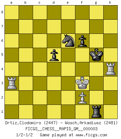 Last move : 1/2-1/2 2020 June 18 0:26:49 [Event "FICGS__CHESS__RAPID_GM__000003"] [Site "FICGS"] [Date "2020.03.18"] [Round "1"] [White "Ortiz,Clodomiro"] [Black "Wosch,Arkadiusz"] [Result "1/2-1/2"] [WhiteElo "2447"] [BlackElo "2481"] 1.d4 Nf6 2.c4 e6 3.Nc3 Bb4 4.e3 O-O 5.Bd3 d5 6.Nf3 c5 7.O-O cxd4 8.exd4 dxc4 9.Bxc4 a6 10.a3 Bxc3 11.bxc3 Qc7 12.Qe2 b5 13.Bd3 Qxc3 14.Bb2 Qc6 15.d5 exd5 16.Rac1 Qd6 17.Be5 Qe7 18.Rc7 Nbd7 19.Qc2 Qxa3 20.Bd4 a5 21.Ng5 h6 22.Nh7 Qb4 23.Nxf6+ Nxf6 24.Bc5 Qa4 25.Bxf8 Qxc2 26.Rxc2 Kxf8 27.Bxb5 g5 28.Ra2 Kg7 29.Ra4 h5 30.Rfa1 h4 31.Rxa5 Rb8 32.Be2 Be6 33.Rb5 Rc8 34.Rb3 Nd7 35.Rb4 h3 36.gxh3 Bxh3 37.Bg4 Bxg4 38.Rxg4 Kg6 39.h4 f6 40.Rg3 Kf5 41.Rf3+ Kg4 42.Kg2 gxh4 43.Ra7 Rd8 44.Ra4+ Kg5 45.Rh3 Nf8 46.R3xh4 Ne6 47.Kg3 Rc8 48.Ra3 Rc1 49.Rg4+ Kf5 50.Rh4 Rg1+ 51.Kf3 Ke5 52.Re3+ Kf5 53.Ra3 Kg5 1/2-1/2 Nimzo-Indian : 4.e3 O-O, 5.Bd3 d5 Kingside Castling by player Black (move 4) Kingside Castling by player White (move 7) 10 pieces endgame at move 42 : White KRRP , Black KRNPPP WHITE : King + 2 Rooks 1 Pawn BLACK : King + 1 Rook 1 Knight 3 Pawns 9 pieces endgame at move 46 : White KRRP , Black KRNPP WHITE : King + 2 Rooks 1 Pawn BLACK : King + 1 Rook 1 Knight 2 Pawns This chess game ended in a draw. Follow this game move after move (download)Daring ideas are like Chess men moved forward. They may be beaten, but they may start a winning game. (Johann Wolfgang von Goethe) Der Traum, für den ich lebe, ist der von einem freien Russland. Viele mögen sagen: Russland hat doch ein Parlament, einen gewählten Präsidenten. Aber ich spüre, dass in meiner Heimat die Angst wiederkehrt. Eine Angst, sich frei zu äußern, bestimmte Dinge zu tun (Garry Kasparov) Yo jugué Ajedrez con el y a veces le pude haber ganado solo que siempre devuelve su última jugada y juega la partida de manera diferente. (Mark Twain) Les erreurs sont comme les malheurs, elles n'arrivent jamais seules. (Siegbert Tarrasch) Treat your password like your toothbrush. Don't let anybody else use it, and get a new one every six months. (Clifford Stoll)