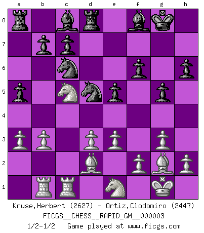 Last move : 1/2-1/2 2020 April 29 23:36:24 [Event "FICGS__CHESS__RAPID_GM__000003"] [Site "FICGS"] [Date "2020.03.18"] [Round "1"] [White "Kruse,Herbert"] [Black "Ortiz,Clodomiro"] [Result "1/2-1/2"] [WhiteElo "2627"] [BlackElo "2447"] 1.Nf3 Nf6 2.g3 g6 3.Bg2 d5 4.c4 dxc4 5.Qa4+ Nfd7 6.Qxc4 Bg7 7.Nc3 Nc6 8.O-O O-O 9.d3 Nb6 10.Qh4 e5 11.Qxd8 Rxd8 12.Bd2 h6 13.Rfc1 Be6 14.Rab1 a5 15.b3 Nd5 16.Na4 f6 17.Nc5 Bc8 18.a3 Bf8 19.e3 g5 20.Ne1 1/2-1/2 Reti : King's Indian attack Kingside Castling by player White (move 8) Kingside Castling by player Black (move 8) This chess game ended in a draw. Follow this game move after move (download)A Chess game is a dialogue, a conversation between a player and his opponent. Each move by the opponent may contain threats or be a blunder, but a player cannot defend against threats or take advantage of blunders if he does not first ask himself: What is my opponent planning after each move ? (Bruce A. Moon) In Buenos Aires ist es nicht mein vorrangiges Ziel ein starkes Turnier zu organisieren, sondern ein Turnier für Gentlemen. Ich würde nie Kamsky einladen. Ich mag keine Probleme. (Miguel Najdorf) ¡Examina movidas que hagan daño! Un buen ojo for movidas desvastantes es mucho mas importante que el conocimiento de principios estratégicos. (Purdy) Même si vous avez un bon coup à faire, regardez toujours s'il n'y en a pas un qui lui soit préférable. (Pedro Damiano) Question: Is 'This statement is paradoxical' a paradoxical statement ? Or is it a meta-paradox ? (Normajean Yates)