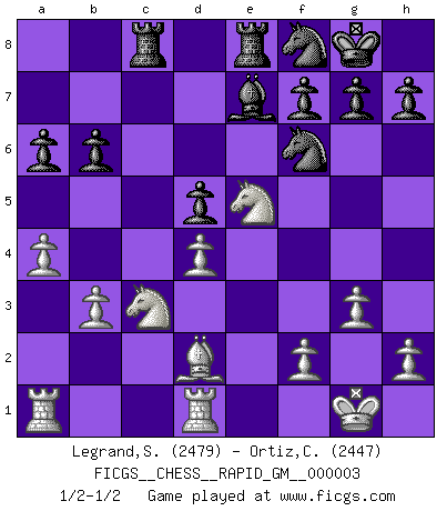 Last move : 1/2-1/2 2020 May 16 21:43:13 [Event "FICGS__CHESS__RAPID_GM__000003"] [Site "FICGS"] [Date "2020.03.18"] [Round "1"] [White "Legrand,Stephane"] [Black "Ortiz,Clodomiro"] [Result "1/2-1/2"] [WhiteElo "2479"] [BlackElo "2447"] 1.d4 Nf6 2.c4 e6 3.g3 d5 4.Nf3 Bb4+ 5.Bd2 Be7 6.Bg2 O-O 7.O-O c6 8.Qc2 b6 9.Rd1 Nbd7 10.b3 Ba6 11.a4 Re8 12.e3 c5 13.Na3 Bb7 14.Ne5 cxd4 15.exd4 Qc8 16.cxd5 Bxd5 17.Bxd5 exd5 18.Qxc8 Raxc8 19.Nb5 a6 20.Nc3 Nf8 1/2-1/2 Catalan Opening Kingside Castling by player Black (move 6) Kingside Castling by player White (move 7) This chess game ended in a draw. Follow this game move after move (download)It is peculiar but a fact nevertheless, that gamblers in chess always have enthusiastic followers. (Botvinnik) Ich verstehe den Grund nicht, warum die Aufteilung in Frauen und Männer überhaupt im Schach besteht. (Judith Polgar) Cuando no sepas que mover, espera por una idea que se le venga a la la cabeza de tu oponente. Tenlo por seguro de que esa idea estará incorrecta. (Siegbert Tarrasch) Les ravages du H expliquent la différence de niveau entre Tal et Thal [Abergel]. The difference between perseverance and obstinacy is that one comes from a strong will, and the other from a strong won't. (Henry Ward Beecher)