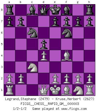 Last move : 1/2-1/2 2020 March 19 10:55:7 [Event "FICGS__CHESS__RAPID_GM__000003"] [Site "FICGS"] [Date "2020.03.18"] [Round "1"] [White "Legrand,Stephane"] [Black "Kruse,Herbert"] [Result "1/2-1/2"] [WhiteElo "2479"] [BlackElo "2627"] 1.d4 Nf6 2.c4 c6 3.Nc3 d5 4.cxd5 cxd5 5.Bf4 Nc6 1/2-1/2 Queen's pawn game This chess game ended in a draw. Follow this game move after move (download)If one piece is badly posted, the whole game is bad. (Tarrasch) Frage: Was machen Sie mit den Preisen? Anwort: Ich habe Angst, dass meine Freundin davon neue Kleider kauft. (Loek van Wely) Uno por uno, yo los acribillé, mi superioridad muy pronto se volvio aparente. (Jose Capablanca) C'est la seule position que je connaisse où les deux camps sont mals. Propos prêtés à V. Anand. If passion drives you, let reason holds the reins. (Benjamin Franklin)