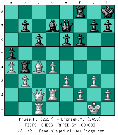Last move : 1/2-1/2 2020 April 29 8:17:30 [Event "FICGS__CHESS__RAPID_GM__000003"] [Site "FICGS"] [Date "2020.03.18"] [Round "1"] [White "Kruse,Herbert"] [Black "Broniek,Mariusz Maciej"] [Result "1/2-1/2"] [WhiteElo "2627"] [BlackElo "2450"] 1.Nf3 d5 2.d4 Nf6 3.c4 e6 4.g3 dxc4 5.Bg2 Bb4+ 6.Bd2 a5 7.Qc2 Bxd2+ 8.Qxd2 c6 9.a4 Ne4 10.Qc2 Nd6 11.O-O Na6 12.Qc3 Nb4 13.Ne5 Nd5 14.Qc1 O-O 15.Na3 Nb6 16.Rd1 Ra6 17.e3 Qe7 18.Bf1 f6 19.Nexc4 Nbxc4 20.Nxc4 Nxc4 21.Bxc4 Rb6 22.b3 Kh8 23.Qc2 Bd7 24.Rac1 Rb4 25.Rd2 1/2-1/2 Reti Opening Kingside Castling by player White (move 11) Kingside Castling by player Black (move 14) This chess game ended in a draw. Follow this game move after move (download)Fischer is completely natural. He plays no roles. He's like a child. Very, very simple. (Zita Rajcsanyi) Heutzutage gewinnt im Turnier nicht derjenige Spieler, der weitreichende Pläne entwirft, sondern einfach jener, der Zug um Zug kämpft. (David Bronstein) Yo no le temo a Spassky. Todos saben que yo soy el mejor. Uno no necesita un torneo para probarlo. (Bobby Fischer) La tactique, c'est ce que vous faites quand il y a quelque chose à faire; la stratégie, c'est ce que vous faites quand il n'y a rien à faire. (Savielli Tartacower) Memory is a way of holding onto the things you love, the things you are, the things you never want to lose. (from the television show: The Wonder Years)