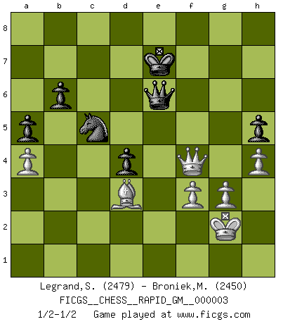 Last move : 1/2-1/2 2020 August 29 11:33:49 [Event "FICGS__CHESS__RAPID_GM__000003"] [Site "FICGS"] [Date "2020.03.18"] [Round "1"] [White "Legrand,Stephane"] [Black "Broniek,Mariusz Maciej"] [Result "1/2-1/2"] [WhiteElo "2479"] [BlackElo "2450"] 1.d4 Nf6 2.c4 e6 3.g3 d5 4.Nf3 dxc4 5.Bg2 Bb4+ 6.Bd2 a5 7.Qc2 Bxd2+ 8.Qxd2 c6 9.a4 Ne4 10.Qc2 Nd6 11.O-O Na6 12.Qc3 Nb4 13.Ne5 Nd5 14.Qc1 O-O 15.Na3 b6 16.Naxc4 Nxc4 17.Nxc4 Nb4 18.Rd1 Ba6 19.b3 Qc7 20.Qb2 Rfd8 21.Rac1 Rac8 22.e4 h6 23.h4 Rb8 24.Rd2 Bxc4 25.bxc4 e5 26.d5 Qd6 27.Rcd1 cxd5 28.cxd5 Na6 29.Qb5 Nc5 30.f3 Qg6 31.Kh2 Rd6 32.Bh3 Qf6 33.Rf1 g6 34.Rc2 Rbd8 35.Rc4 Qe7 36.Rf2 h5 37.Qb1 Kg7 38.Qc2 Rf8 39.Re2 Kh7 40.Qd2 R6d8 41.Qe3 Rd6 42.Qc3 Re8 43.Rb2 Red8 44.Rd2 Kg8 45.Rb2 Qe8 46.Qc2 Qe7 47.Qc3 Rf8 48.Qc2 Qd8 49.Ra2 Qe7 50.Rb2 Qd8 51.Ra2 f5 52.exf5 gxf5 53.Bxf5 Rxd5 54.Be4 Rd4 55.Rxd4 exd4 56.Qd1 Rf6 57.Rd2 Rd6 58.Bd3 Qf6 59.Kg2 Kf8 60.Re2 Rc6 61.Qd2 Rd6 62.Re1 Kg7 63.Re2 Rd7 64.Re1 Rd6 65.Re2 Kf8 66.Re1 Re6 67.Rxe6 Qxe6 68.Qf4+ Ke7 1/2-1/2 Catalan Opening Kingside Castling by player White (move 11) Kingside Castling by player Black (move 14) This chess game ended in a draw. Follow this game move after move (download)Fischer was a master of clarity and a king of artful positioning. His opponents would see where he was going but were powerless to stop him. (Bruce Pandolfini) Wir irren allesamt, nur jeder irrt anders. (Georg Christoph Lichtenberg) Los errores estan ahí, esperando a que se cometan. (Savielly Tartakower) Toutes choses étant égales, c'est la conviction qui gagne. Alliée à une volonté de vaincre, elle sert de détonateur, suscite des idées, disperse les doutes et aide à penser clairement. (Robert Fischer) Internet: Absolute communication, absolute isolation. (Paul Carvel)