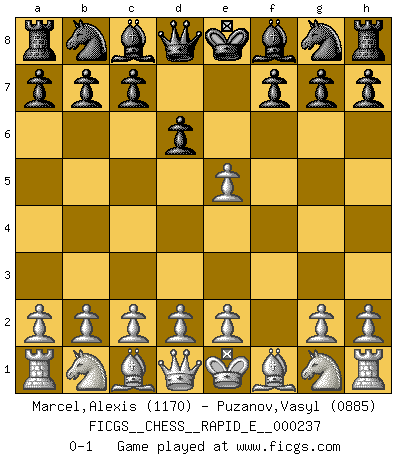 Last move : 0-1 2020 April 28 15:22:11 [Event "FICGS__CHESS__RAPID_E__000237"] [Site "FICGS"] [Date "2020.03.19"] [Round "1"] [White "Marcel,Alexis"] [Black "Puzanov,Vasyl"] [Result "0-1"] [WhiteElo "1170"] [BlackElo "0885"] 1.f4 e5 2.fxe5 d6 0-1 This chess game has been lost on time (started : 2020.03.19 18:30:27) Bird : From gambit Player Black won this chess game. Follow this game move after move (download)When you play Bobby, it is not a question if you win or lose. It is a question if you survive. (Boris Spassky) Es gibt zwei Arten von Opfern: Korrekte und meine. (Mikhail Nekhemyevich Tal) El jugador táctico sabe que hacer cuando hay algo que hacer; mientras que el estratega sabe que hacer cuando no hay nada que hacer. (Gerald Abrahams) Il n'y a plus de joueurs du niveau de Jacob Murray dont la seule quête est le beau jeu, le plaisir de voir les pièces construire quelque chose. Sur 10 idées à la minute, 9 seront sans intérêt, la dernière s'avèrera géniale. (Christian Bauer) A generalist learns less and less about more and more until he knows nothing about everything. (Author unknown)