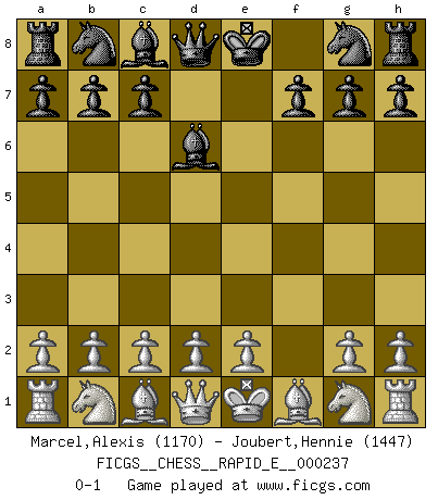 Last move : 0-1 2020 April 25 11:8:42 [Event "FICGS__CHESS__RAPID_E__000237"] [Site "FICGS"] [Date "2020.03.19"] [Round "1"] [White "Marcel,Alexis"] [Black "Joubert,Hennie"] [Result "0-1"] [WhiteElo "1170"] [BlackElo "1447"] 1.f4 e5 2.fxe5 d6 3.exd6 Bxd6 0-1 This chess game has been lost on time (started : 2020.03.19 18:30:27) Bird : From gambit Player Black won this chess game. Follow this game move after move (download)Chess is a matter of delicate judgment, knowing when to punch and how to duck. (Bobby Fischer) Ich verlor meine Bürgerrechte, mein Gehalt wurde mir nicht mehr bezahlt und ich wurde zensiert und durfte nicht mehr ins Ausland reisen. [nach dem Match Fischer-Taimanov 6:0] (Mark Taimanov) Evita las multitudes. Haz independientemente tu propio razonamiento. Trata de ser el jugador de Ajedrez, no la pieza de Ajedrez. (Ralph Charell) Je menace de comprendre la position. (Anonyme) Over-the-board chess is the favorite of mortals, correspondence chess is the favorite of the gods. (Eduard Dyckhoff)