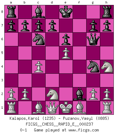 Last move : 0-1 2020 May 1 19:50:50 [Event "FICGS__CHESS__RAPID_E__000237"] [Site "FICGS"] [Date "2020.03.19"] [Round "1"] [White "Kalapos,Karol"] [Black "Puzanov,Vasyl"] [Result "0-1"] [WhiteElo "1235"] [BlackElo "0885"] 1.d4 Nf6 2.c4 e5 3.dxe5 Ng4 4.Nf3 Nc6 5.e6 fxe6 6.e4 Qf6 7.Nbd2 Bc5 8.e5 Qg6 9.Nh4 Bxf2+ 0-1 Budapest : Adler variation Player Black won this chess game. Follow this game move after move (download)The game of chess is the touchstone of the intellect. (Goethe) Meine Liebe ist Schach, Schach, Schach. Ich muss jeden Tag Schach spielen, deshalb fühle ich mich so stark. (Miguel Najdorf) No soy una persona materialista y por eso, no resiento la falta o pérdida del dinero. La ausencia de cosas mundanas carece de importancia. Ya que el Ajedrez es una forma en la que puedo ser tan materialista como yo desee sin tener la necesidad de vender mi alma. (Jamie Walter Adams) La guerre est enfant de la passion, la passion est enfant du narcissisme et le narcissisme est l'enfant. (...) Une autre partie ? (Thibault de Vassal) When a man with money meets a man with experience, the man with experience leaves with money and the man with money leaves with experience. (Anonymous)