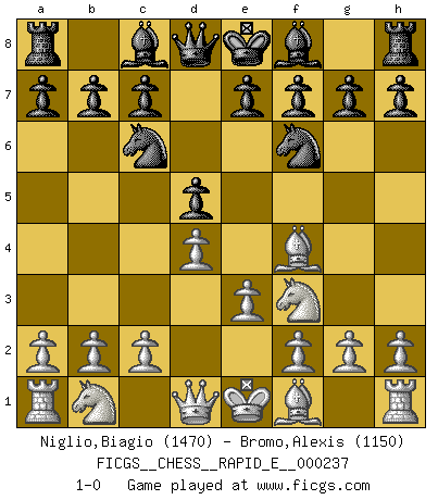 Last move : 1-0 2020 April 25 11:8:42 [Event "FICGS__CHESS__RAPID_E__000237"] [Site "FICGS"] [Date "2020.03.19"] [Round "1"] [White "Niglio,Biagio"] [Black "Bromo,Alexis"] [Result "1-0"] [WhiteElo "1470"] [BlackElo "1150"] 1.d4 d5 2.Nf3 Nc6 3.Bf4 Nf6 4.e3 1-0 This chess game has been lost on time (started : 2020.03.19 18:30:27) Queen's pawn game, Chigorin variation Player White won this chess game. Follow this game move after move (download)A sacrifice is best refuted by accepting it. (Wilhelm Steinitz) Es ist schade, dass viele Schachsportler vergessen, wie wichtig Auftreten und angemessene Kleidung sind. (Alexandra Kosteniuk) Al jugar al Ajedrez entonces, podemos aprender: Primero: Previsión... Segundo: Prudencia... Tercero: Cautela... Y al final, aprendemos del Ajedrez el hábito de no ser desanimados por apariencias malas presentes en el estado de nuestros asuntos, el hábito de la esperanza por una oportunidad favorable y la perseveración de los secretos de los recursos. (Benjamin Franklin) Ce qui est bien, c'est d'avoir tout un tas de pièces en prise : l'adversaire ne peut en prendre qu'une à la fois. Cité par Thierry Audin. Creativity involves breaking out of established patterns in order to look at things in a different way. (Edward De Bono)