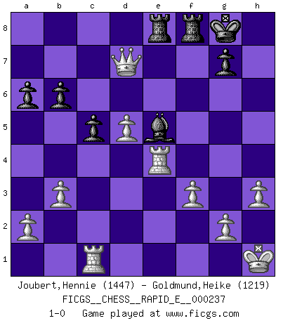 Last move : 1-0 2020 May 22 18:56:0 [Event "FICGS__CHESS__RAPID_E__000237"] [Site "FICGS"] [Date "2020.03.19"] [Round "1"] [White "Joubert,Hennie"] [Black "Goldmund,Heike"] [Result "1-0"] [WhiteElo "1447"] [BlackElo "1219"] 1.d4 Nf6 2.c4 b6 3.Nc3 Bb7 4.e3 e6 5.Nf3 c5 6.Be2 Be7 7.O-O O-O 8.b3 d6 9.Bb2 a6 10.Rc1 Nbd7 11.d5 exd5 12.Nxd5 Nxd5 13.cxd5 Nf6 14.Bxf6 Bxf6 15.e4 Re8 16.Bc4 Rxe4 17.Qc2 Qe7 18.Bd3 Rf4 19.Rfe1 Qd7 20.Bxh7+ Kh8 21.Be4 Re8 22.Nd2 Qg4 23.f3 Qg5 24.Nc4 Bd4+ 25.Kh1 Rh4 26.Nxd6 Qe5 27.Nxf7+ Kg8 28.Nxe5 Bxe5 29.h3 Bc8 30.Bf5 Bxf5 31.Qxf5 Rf4 32.Qd7 R4f8 33.Re4 1-0 Queen's Indian Accelerated Kingside Castling by player White (move 7) Kingside Castling by player Black (move 7) Player White won this chess game. Follow this game move after move (download)Methodical thinking is of more use in Chess than inspiration. (C. J. S. Purdy) Die westlichen Werte sind eine Sprache, welche die Putin-Administration nicht versteht. (Garry Kasparov) En el Ajedrez, tal como en la vida, las bendiciones de hoy pueden ser el veneno del mañana. (Assaic) Je fais ceci parce que dans cinquante coups j'obtiendrai cela; je m'appelle Mikhail Moisevitch Botvinnik. (Botvinnik) Just because you do not take an interest in politics doesn't mean politics won't take an interest in you. (Pericles 430 B.C.)