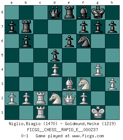 Last move : 0-1 2020 June 2 9:34:10 [Event "FICGS__CHESS__RAPID_E__000237"] [Site "FICGS"] [Date "2020.03.19"] [Round "1"] [White "Niglio,Biagio"] [Black "Goldmund,Heike"] [Result "0-1"] [WhiteElo "1470"] [BlackElo "1219"] 1.d4 Nf6 2.Nf3 e6 3.Bf4 b6 4.e3 Bb7 5.Nbd2 c5 6.Bd3 d6 7.c3 Be7 8.h3 O-O 9.Qe2 Nbd7 10.O-O Qc7 11.e4 cxd4 12.cxd4 Rfe8 13.Rac1 Qd8 14.Ba6 Rb8 15.Bxb7 Rxb7 16.Rc3 d5 17.e5 Nh5 18.Be3 Bb4 19.Rc2 Be7 20.Rfc1 Bf8 21.g4 Nhf6 22.exf6 Nxf6 0-1 This chess game has been lost on time (started : 2020.03.19 18:30:27) Queen's pawn game Kingside Castling by player Black (move 8) Kingside Castling by player White (move 10) Player Black won this chess game. Follow this game move after move (download)Your body has to be in top condition. Your Chess deteriorates as your body does. You can't separate body from mind. (Bobby Fischer) Wenn du gegen Bobby spielst, ist es keine Frage von gewinnen oder verlieren. Es ist eine Frage des Überlebens. (Boris Vassilievich Spassky) Morphy probablemente fue el genio más grande de todos. (Bobby Fischer) Vous savez, camarade Pachman, je n'éprouve pas de plaisir à être ministre, je jouerais plutôt aux échecs comme vous, ou alors ferais une révolution au Venezuela. (Che Guevara à Ludek Pachman, 'Checkmate in Prague', 1975) Art is the only way to run away without leaving home. (Twyla Tharp)