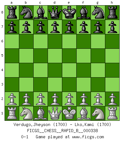 Last move : 0-1 2020 April 20 19:0:52 [Event "FICGS__CHESS__RAPID_B__000338"] [Site "FICGS"] [Date "2020.03.21"] [Round "1"] [White "Verdugo,Jheyson"] [Black "Lko,Kami"] [Result "0-1"] [WhiteElo "1700"] [BlackElo "1700"] 0-1 This chess game has been lost on time (started : 2020.03.21 13:55:56) Player Black won this chess game. Follow this game move after move (download)Those who say they understand Chess, understand nothing. (Robert Hubner) Du weisst es gibt ein Problem mit Computern und Fernschach, wenn jeder eine Rating von 2450 hat. (John Christen Knudsen) El Ajedrez no es como la vida... ¡tiene reglas!. (Mark Pasternak) La vie et les Echecs sont tous les deux une lutte constante. (Lasker) The Internet is the first thing that humanity has build that humanity doesn't understand, the largest experiment in anarchy that we have ever had. (Eric Schmidt)