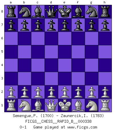 Last move : 0-1 2020 April 20 19:0:52 [Event "FICGS__CHESS__RAPID_B__000338"] [Site "FICGS"] [Date "2020.03.21"] [Round "1"] [White "Semengue,Pierre Paul"] [Black "Zaunercik,Ilmar"] [Result "0-1"] [WhiteElo "1700"] [BlackElo "1783"] 0-1 This chess game has been lost on time (started : 2020.03.21 13:55:56) Player Black won this chess game. Follow this game move after move (download)The hallmark of the artist is simplicity. (Larry Evans) Den Ruhm habe ich schon, jetzt brauche ich noch das Geld. (Wilhelm Steinitz) Debió haber existido una vez en que los hombres eran semidióses, de otra manera no hubiesen podido inventar el Ajedrez. (Gustav Schenk) Les échecs sont plus proches de l'art de l'assassinat que de l'art de la guerre. (Arturo Perez-Reverte) Knowledge will give you power, but character respect. (Bruce Lee)