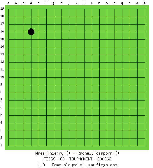Last move : 1-0 2020 April 24 22:51:28 [Event "FICGS__GO__TOURNAMENT__000062"] [Site "FICGS"] [Date "2020.03.23"] [Round "1"] [Black "Maes,Thierry"] [White "Rachel,Tosaporn"] [Result "1-0"] 1.d16 1-0 This go game has been lost on time (started : 2020.03.23 22:24:10) Here are the names of the openings (joseki) played in the four corners : Player Black won this Go (weiqi, baduk) game. Follow this game move after move (download)Be a little patient. Keshi works ! (Anonymous) If passion drives you, let reason holds the reins. (Benjamin Franklin)